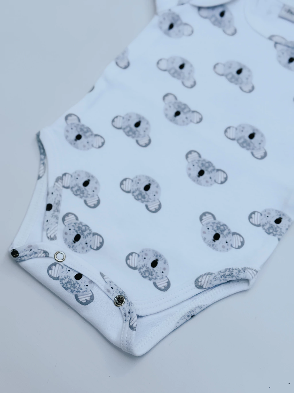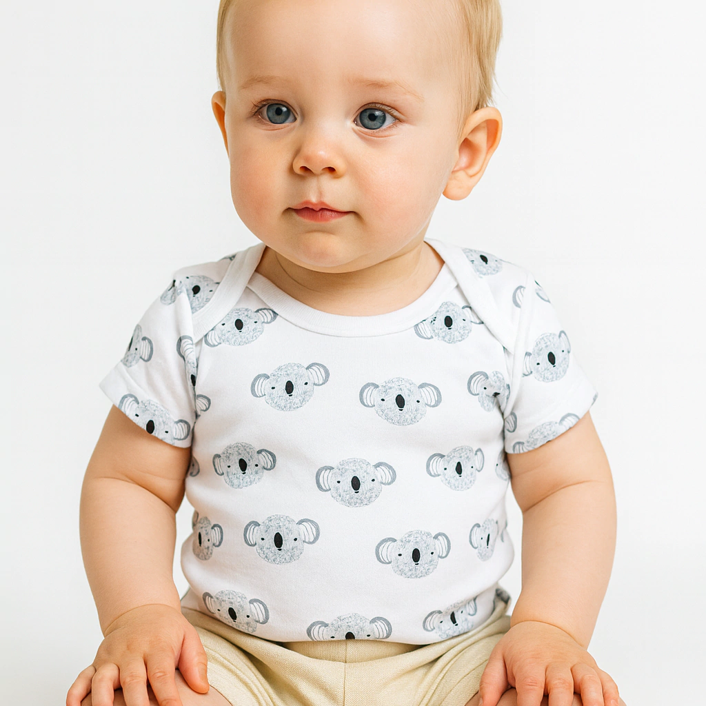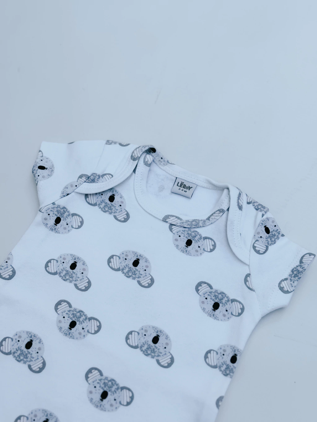 🎨 Diseño: El modelo Koala se luce con una estampa full de koalitas adorables que llenan de ternura cada rincón de la prenda. Tiene cuello tipo americano que facilita el paso de la cabeza sin incomodar, y broches hipoalergénicos en la parte inferior para cambiar el pañal de forma práctica y rápida.