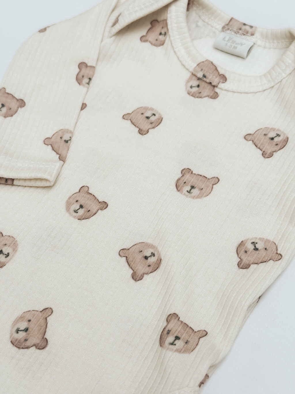 🌟 Diseño: Cuello americano para vestir sin enrosques y brochecitos hipoalergénicos en la parte inferior, que facilitan el cambio de pañal en cualquier momento. El detalle más tierno: ¡la estampa de ositos pequeños! Un mimo a la vista que lo hace aún más especial.