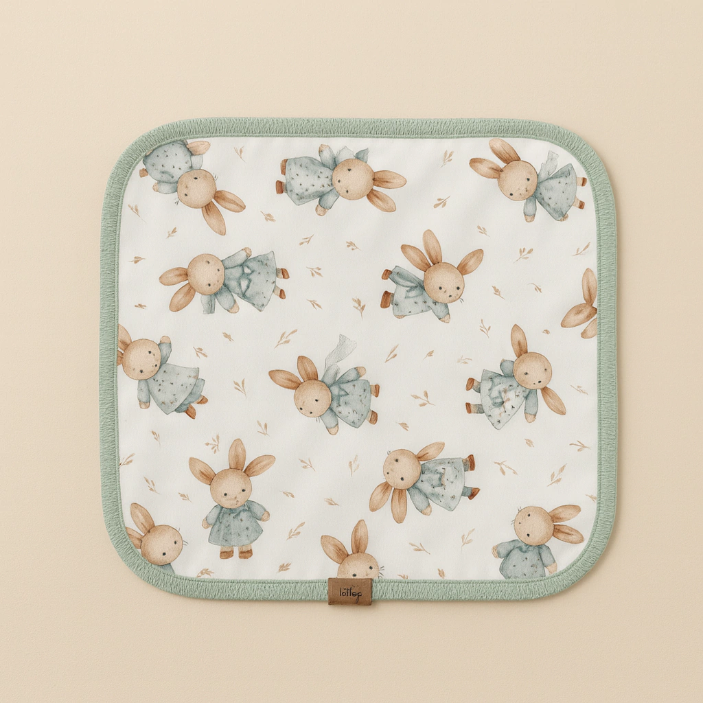 🐰 Babita estampada con conejitos, con guarda verde a tono, perfecta para acompañar cada toma y sumar estilo al conjunto.