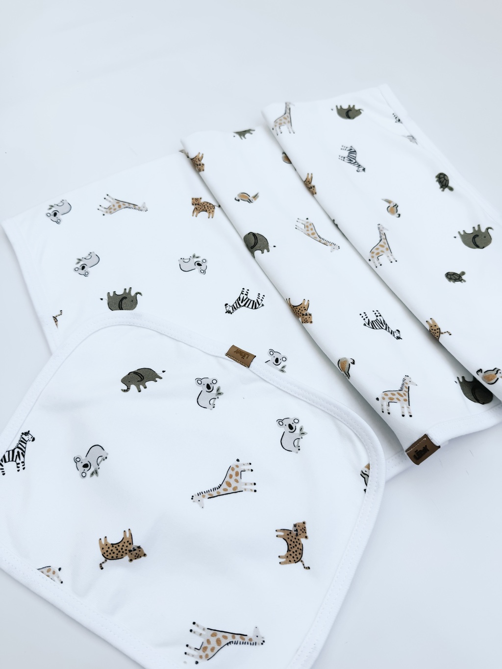 🌟 Diseño: La manta recibidora reversible (56cm x 70cm) cuenta con dos opciones de uso para variar su look y funcionalidad. La babita (25cm x 20cm) es perfecta para absorber pequeños derrames y proteger su ropita. Con un tierno estampado de animalitos, este set combina dulzura y practicidad.