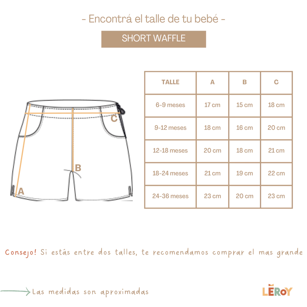 Materiales: Este shortcito está confeccionado en tejido waffle, una tela ligera y transpirable que brinda una gran suavidad para mantener a tu pequeño fresco y cómodo durante los días más calurosos. Es ideal para el verano, ya que, permite que la piel respire y que tu bebé se mueva con total libertad.